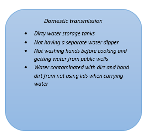 Contaminated or polluted soil directly affects human health through direct contact with soil or via inhalation of soil contaminants which have vaporized; potentially greater threats are posed by the infiltration of soil contamination into groundwater aquifers used for human consumption, sometimes in areas apparently far removed from any apparent source of above ground contamination. One of the biggest domestic transmissions is the fact that people who reside in Ger areas wear same shoes that they wore in their outside bathrooms and their kids get infections by playing on the floor where the people who wore same shoes in the bathroom stepped on.