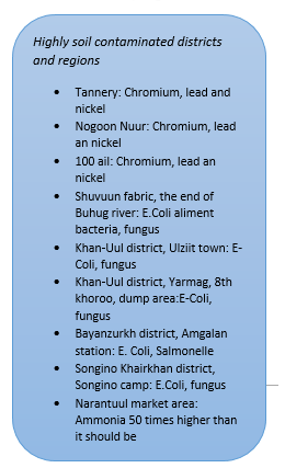 Soil pollution or soil contamination is caused by the presence of xenobiotic (human-made) chemicals or other alteration in the natural soil environment. It is typically caused by industrial activity, agricultural chemicals, or improper disposal of waste. Especially human waste, (or human excreta) both liquid and solid, the remains of plants, and domestic and industrial wastewater contribute to soil pollution. Ulaanbaatar city Health Department conducts soil tests twice a year (May and October) in around 50 densely populated areas in 9 districts.